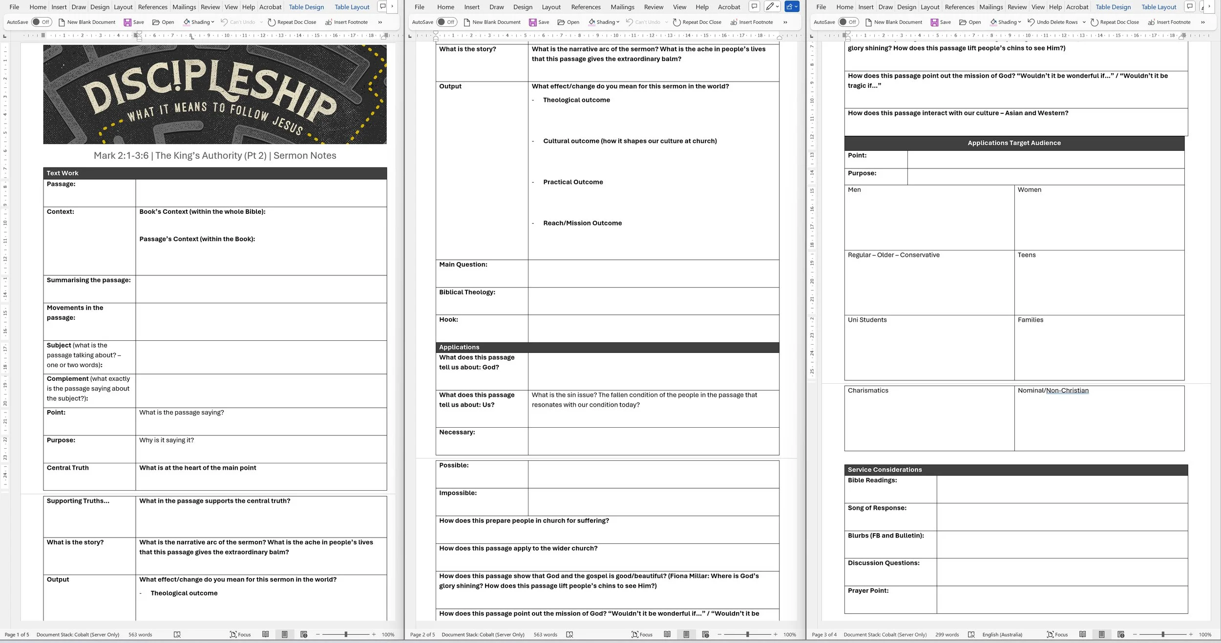 My Sermon Notes document is pretty extensive and asks heaps of questions about the passage and heaps of application questions. It’s designed to slow me down and help me think through the passage and sermon.